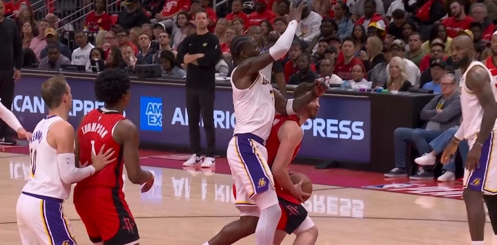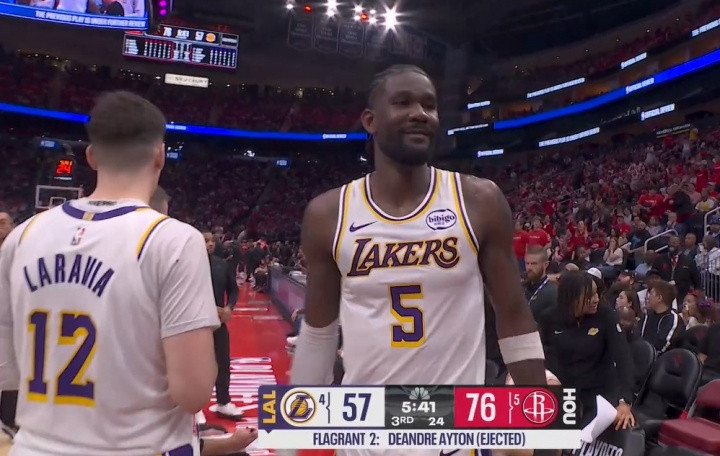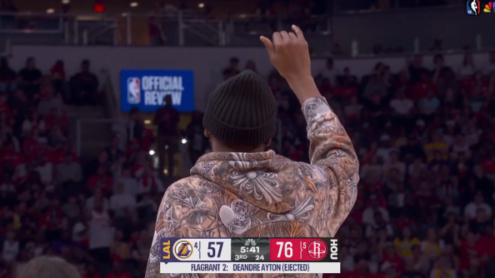 北京时间4月27日,NBA季后赛西部首轮G4湖人再战火箭,下半场出现突然事件,湖人中锋艾顿因肘击申京吃到二级恶意犯规,直接被驱逐离场,杜兰特冲他挥手再见。